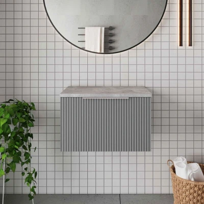 Fluted Wall Hung 1 Drawer Vanity Unit with Bellato Grey Worktop 600mm Wide Satin Hudson Reed