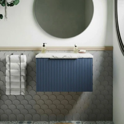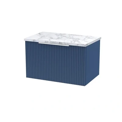 Fluted Wall Hung 1 Drawer Vanity Unit with Carrera Marble Worktop 600mm Wide Satin Blue Hudson Reed
