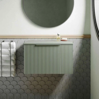 Fluted Wall Hung 1 Drawer Vanity Unit with Worktop 600mm Wide Satin Green Hudson Reed