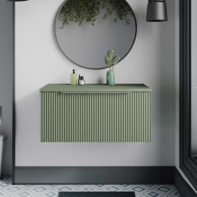 Fluted Wall Hung 1 Drawer Vanity Unit with Worktop 800mm Wide Satin Green Hudson Reed