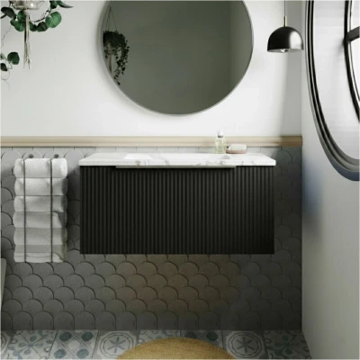 General description Eye-catching and functional, the retro-inspired Fluted collection of vanity units features a corrugated-style front. Hudson Reed offers incredible flexibility with this cabinet, providing a wide choice of exciting colors and many countertop styles for total customization. The unit comes with understated chrome finger-pull handles as standard, with various upgrade options available. Please note that the manufacturer has updated the color name from "Satin Anthracite" to "Soft Black," but the color remains the same. Technical specifications Furniture Type: Vanity Unit Mounting: Wall Total Height (Unit + Countertop): 381mm Total Width (Unit + Countertop): 805mm Total Depth (Unit + Countertop): 390mm Unit Height: 359mm Unit Width: 800mm Unit Depth: 383mm Drawers: 1 Basin Type: Vessel (Not Included) Countertop Colour/Finish: Carrera Marble Countertop Material: Laminate Countertop Shape: Rectangular Countertop Thickness/Height: 22mm Countertop Width: 805mm Countertop