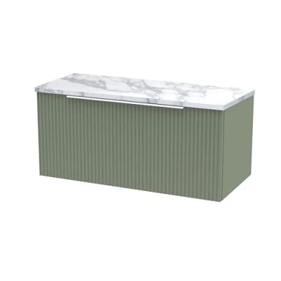 Fluted Wall Hung 1 Drawer Vanity with Carrera Marble Worktop 800mm Wide Satin Green Hudson Reed
