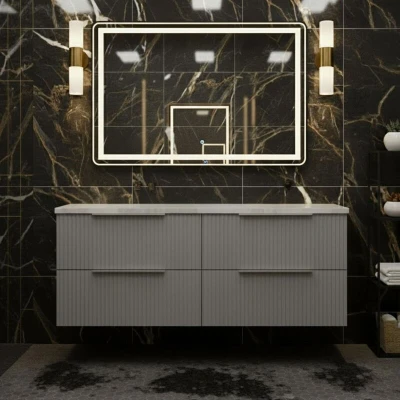General description The eye-catching Fluted twin vanity unit from Hudson Reed is characterized by a corrugated-style drawer front with retro inspiration. This expansive twin unit includes a large countertop suitable for 2 vessel basins, creating a focal point in any vibrant, contemporary bathroom. The understated satin grey finish offers a soft contrast against white ceramics, while the striking twin vanity unit design adds aesthetic appeal. Technical specifications Total Height (Unit + Countertop): 522mm Total Width (Unit + Countertop): 1205mm Total Depth (Unit + Countertop): 390mm Unit Height: 500mm Unit Width: 1200mm Unit Depth: 383mm Countertop Colour/Finish: Bellato Grey Countertop Material: Laminate Countertop Shape: Rectangular Countertop Thickness/Height: 22mm Countertop Width: 1205mm Countertop Depth/Projection: 390mm Cabinet Material: MFC Fascia Material: MDF Weight: 50.00kg Compatibility and accessories Compatible with matching tall units and WC units within the Fluted