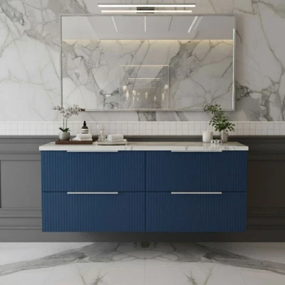 Fluted Wall Hung 4 Drawer Vanity Unit with Carrera Marble Worktop 1200mm Wide Satin Blue Hudson Reed