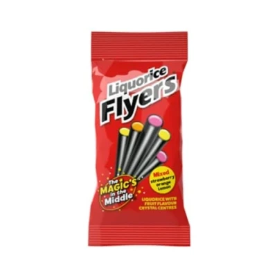 Delicious combination of chewy liquorice sticks with tangy fruit crystal centres Contains 3 delicious flavours: strawberry, orange & lemon Flyers have delighting generation of liquorice lovers since 1946 Each box contains 12 x 75g packs Suitable for Vegans