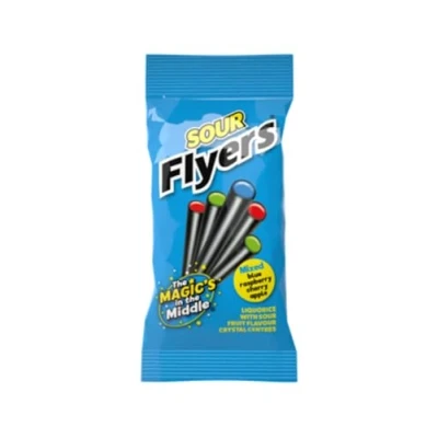 Delicious combination of chewy liquorice sticks sour fruit crystal centres Contains 3 delicious sour flavours: blue raspberry, cherry and apple Flyers have delighting generation of liquorice lovers since 1946 Each box contains 12 x 75g packs Suitable for Vegans
