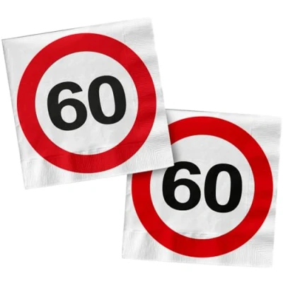 These simply belong to a festive table. Pack of 20 Napkins, Traffic Sign 60, 33 x 33 cm. Contents: 20 napkins. You can use this item for the following party occasions: birthday, anniversary. These napkins complete the table decoration collection "Traffic Sign n 60". Printed on one side and chlorine free. This item is made of paper.