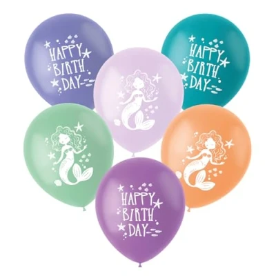 This is the mermaid party! Latex Balloons - Mermaid Magic - 33 cm - Pack of 6. For children who want to celebrate their birthday with an enchanting underwater theme. Suitable for any season. Bright and trendy colours with elegant underwater flair. This collection features numerous ocean-inspired decorations that transform any room into a magical underwater world. You can use this item for party occasions: children's party, birthday party. A cheerful set of 6 balloons: purple, purple, lavender with the text "Happy Birthday Day" and a turquoise, aquamarine and peach balloon with a mermaid on it. This balloon set belongs to the Mermaig Magic collection by Folat., Manufacturer: Folat