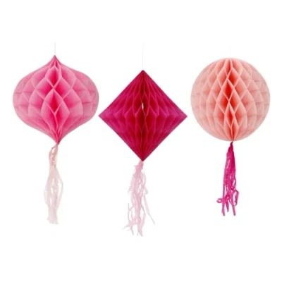 A stylish classic in pretty pink. Honeycomb Ball Set - Perfect Pink - Pack of 3. Contents: 3 honeycomb balls. You can use this item for the following party occasions: birthday, theme party, baby shower. Stunning durable honeycomb in three shades of pink. Shapes: rhombus, round (30 cm diameter) and oval (25 x 30 cm). Each honeycomb hangs a 25cm long paper tassel in a contrasting shade of pink. Honeycombs are folded and can be unfolded for use. The decoration can be hung on the attached cotton cord. With paper clip to hold the compartments in round shape. This item is made of FSC paper.