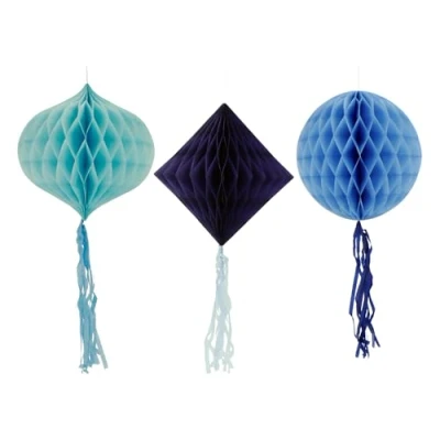 A stylish classic in bold blue. Honeycomb Ball Set - Bold Blue - Pack of 3. Contents: 3 honeycomb balls. You can use this item for the following party occasions: birthday, theme party, baby shower. Stunning heavy duty honeycombs in three shades of blue. Shapes: rhombus, round (30 cm diameter) and oval (25 x 30 cm). Each honeycomb hangs a 25cm long paper tassel in a contrasting shade of blue. Honeycombs are folded and can be unfolded for use. The decoration can be hung on the attached cotton cord. With paper clip to hold the compartments in round shape. This item is made of FSC paper. This item is made of FSC paper.