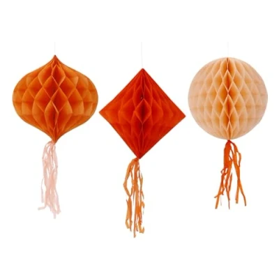 This stylish classic is "pretty peach" Honeycomb Ball Set - Pretty Peachy - 3 Pieces Contains: 3 x Honeycomb Ball For example, for the following party/celebration occasions: birthdays, theme parties. Wonderful and sturdy honeycomb ball in three shades of orange. In the shapes: rhomboid, round (diameter 30 cm) and oval (25 x 30 cm). From each honeycomb hangs a 25 cm long paper tassel in a contrasting orange shade. The honeycombs are folded and can be simply opened for use. The decoration can be easily hung on the cotton cord. With staples to keep the fans in round shape. This item is made of FSC paper.