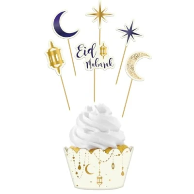 So everything tastes even better. Eid Mubarak Cupcake Decorations Set of 12 Contents: pack of 12 cupcake decorations. You can use this item for the following party occasions: Eid Mubarak, theme party. This cupcake decoration set consists of 6 cupcake wrappers and 6 festive picks: a blue moon, a golden moon, a blue star, a gold star, a gold oil lamp and one with the text 'Eid Mubarak'. The moulds and the figures on it. The skewers are made of printed (hot stamping) paper on one side, the skewers themselves are made of wood and are 8.5 cm long. This item is made of paper and wood., Manufacturer: Folat