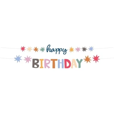 A birthday with stars! Letter Garland Kit - Happy Birthday - Starburst - 1.5 Meters Contents: 1 set of letter garlands. The garland consists of two parts: a garland with the text "happy" (approx. 11.5 cm high) with 4 coloured stars on both sides and a garland with the text "BIRTHDAY" (approx. 14 cm high) with 2 coloured stars on both sides. Both streamers are 1.5 metres long. You can use this item for the following party occasions: birthday, theme party. This letter garland set looks cheerful and friendly and is therefore suitable for all birthdays of the whole family. This letter garland set is part of the Starburst collection by Folat. This item is made of FSC paper.