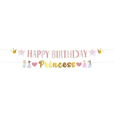 Hipp Hipp for the princess! Letter garland set - Pretty Princess - 1.5 metres. Fairytale charm meets royal charm. With soft colour combinations and sparkling details, this collection will make any birthday a royal dream. From an enchanting carriage pinata to colourful garlands to beautiful tableware. Each product in the Pretty Princess collection adds a touch of elegance to the atmosphere and is ideal for memorable princess themed parties and celebrations. You can use this item for party occasions: children's party, birthday party. With real shiny gold thanks to the hot stamping technique used. The garland consists of two parts: a garland with the text "Happy Birthday" (letters approx. 14 cm high) with a golden crown and a pink carriage on each side and a garland with the golden text "Princess" (letters approx. 14 cm high) with 2 princesses and a pink heart on each side. Printed on both sides. All parts slide back and forth over the pink ribbon. The ribbons of the two garlands are 1.7 metres long. This letter garland set belongs to the Pretty Princess collection by Folat.