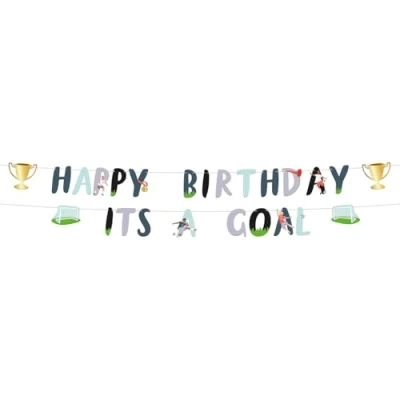 The birthday child always scores! Letter garland set – Fantastic Football – 1.5 metres. Contents: 1 letter garland consisting of 2 parts. This item is made of paper. You can use this item for party occasions: children's party, birthday party. The garland consists of two parts: a garland with the inscription "Happy Birthday" (approx. 14 cm high letters) and a golden master cup on both sides as well as a garland with the inscription "ITS A GOAL" (approx. 14 cm high letters) and a football goal on both sides. Printed on both sides. All parts can be pushed back and forth over the light grey ribbon. All golden details really shine thanks to the hot stamping technique used. The ribbons of the two garlands are 1.7 metres long. This letter garland set is part of the Fantastic Football collection by Folat. Fantastic Football is a comprehensive football collection. Popular, gender-neutral, active and fresh. Offers everything to celebrate birthdays and football festivals in general. Suitable for any season, anywhere.