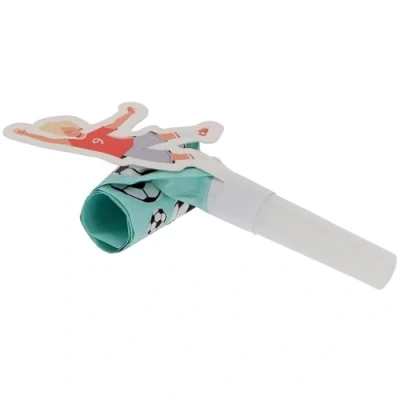 Horns for footballers! Tongue Trumpets - Fantastic Football - 6 pieces. Contains: 6 Tongue Trumpets For example, for the following party/celebration: children's party, birthday, football. Super fun ball tongues suitable for any football party. There are 6 in a pack and they are blue with footballs on top. They have a cardboard footballer as an extra decoration. These ball tabs are part of the Fantastic Football Collection by Folat. This item is made of paper., Manufacturer: Folat