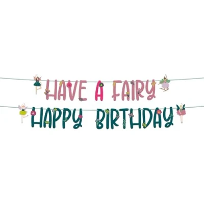 For a real fairy birthday! Letter garland set - Fabulous Fairy - 2 metres. A playful and versatile collection to design and decorate a fairytale forest party for children that protects the environment at the same time. Wonderful in any season. You can use this item for party occasions: children's party, birthday party. The garland consists of two parts: a garland with the inscription "HAVE A FAIRY" (approx. 14 cm high letters) with a dancing fairy on both sides and a garland with the inscription "Happy Birthday" (approx. 14cm high letters) with a dancing fairy on both sides. Printed on both sides. All parts can be pushed back and forth over the strap. The ribbons of the two garlands are 2 metres long. This letter garland set belongs to the Fabulous Fairy collection by Folat. This item is made from FSC certified paper.