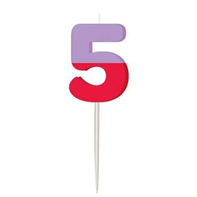 As a party on the cake! Candle - Stripetastic - Number 5 A cheerful and attractive party collection with bright and colourful stripes for everyone. Offers a very extensive range of fun and festive items that can be used all year round for any celebration and event. Contents: 1 x number candle. You can use this item for the following party occasions: birthday, children's party, anniversary. This candle has the shape of the number "5". The top is purple and the bottom is red. This candle measures approximately 5cm tall and 8mm thick. The total length of the candle (including the punch, without wick) is about 9 cm. This item is made of wax.