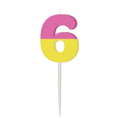 As a party on the cake! Candle - Stripetastic - Number 6 A cheerful and attractive party collection with bright and colourful stripes for everyone. Offers a very extensive range of fun and festive items that can be used all year round for any celebration and event. Contents: 1 x number candle. You can use this item for the following party occasions: birthday, children's party, anniversary. This candle has the shape of the number "6". The top is purple-pink and the bottom is yellow. This candle measures approximately 5cm tall and 8mm thick. The total length of the candle (including the punch, without wick) is about 9 cm. This item is made of wax.