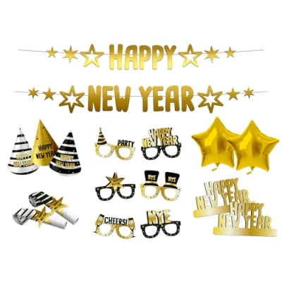 A great New Year's Eve! Happy New Year Party Box, BlackGold HNY New Year party decorations: these New Year party supplies have many interesting elements of the New Year theme, and black gold is used as the main color to make your party more shiny This New Year's party decoration can be used not only for New Year's Eve parties, New Year's Eve family gatherings, New Year's costume parties With this party package, every New Year party is immediately well decorated. All in the same elegant BlackGold HNY theme, with no less than 28 party items: 2 letter garlands, 6 party hats, 6 roller tabs, 6 paper party glasses, 6 tiaras and 2 gold foil balloons Quality materials: Our products are made of strong and durable material. They are ideal for party decoration and can surprise any party, Manufacturer: Folat