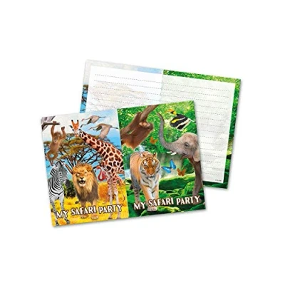 16-piece folding invitation card set with 8 invitations and 8 envelopes with the motif "Safari" Size: postcard size when opened: double postcard size Neatly shrink-wrapped Manufacturer: Folat Matching Safari plates, cups, napkins, straws, invitations, garlands, balloons and party bags are available in this range, Manufacturer: Folat