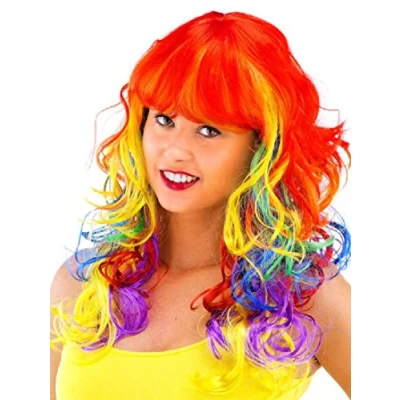 Long hair wig with fringe and rainbow curls. The wig is suitable for adults and one size fits most. The wig is made of polyester and all of our wigs are fire resistant treated. Wear this wig during carnival,theme parties and halloween. Folat has a wide range of interesting party products, all created in accordance with European safety standards.We deliver smiles., Manufacturer: Folat