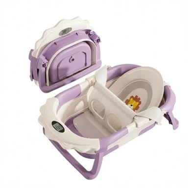 Foldable Baby Bathtub with Thermometer and Bath Cushion Support – Digital Temperature Display – Lion Model Purple and White