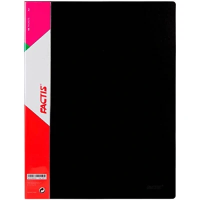 Black plastic hard cover folder, rough finish. Loin with removable foil to customize the label. Contains 10 clear covers (size A4).