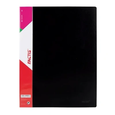 Black plastic hard cover folder, rough finish. Loin with removable foil to customize the label. Contains 40 clear covers (size A4).