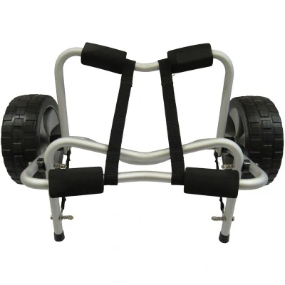 General description This Folding Kayak Trolley is designed to make transporting your kayak or canoe effortless. With its lightweight yet strong aluminum structure, it provides a reliable solution for moving your watercraft without the risk of damage. The trolley features two kickstands for added stability and can support a weight capacity of up to 100LB (45.35KG), making it suitable for larger kayaks and canoes. Its large, puncture-proof polyurethane wheels ensure easy maneuverability on rough terrain, and the trolley can be easily assembled and folded for convenient storage. Technical specifications Height: 40 CM Length: 66 CM Width: 40 CM Strap Length: 3.5 M Folded Width: 25 CM Weight: 3.36 kg Capacity: 45.35 KG Product Code: SFZZQJKY001