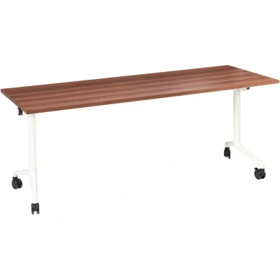 Mobile Foldable Office Desk with Metal Frame. Enhance your office space with the perfect blend of practicality and convenience with this folding desk. Its foldable top allows for easy storage when not in use, making it an excellent choice for compact areas. The desk is equipped with lockable casters, ensuring both stability and mobility, so you can move and secure it as needed. Ideal for home offices and various work environments, this piece offers a stylish and functional workspace solution. Details: Product Type: Foldable Office Desk General Color: Brown, White Frame Colour: White Shade: Dark Brown Material Type: Engineered Wood Main Material: Melamine-Faced Chipboard (MFC) Additional Material: Synthetic Material Legs material: Metal Top Material: Engineered Wood Shape: Rectangular Drawers: No Finish: PVC Foil Dimensions: Depth: 60 cm Width: 180 cm Height: 73 cm Weight: 21 kg Weight Capacity: 80 kg Offer Includes: 1 x Desk Key Features: Swivel Castors with Locking Brake, Portable