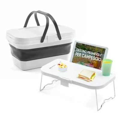 LARGE CAPACITY: Foldable picnic basket with a capacity of 16 litres to hold everything you need for picnic. Convenience: Equipped with carrying handles, coasters and cellphone/tablet slot to keep things tidy during use Versatility: The lid converts into a folding tray or table thanks to the metal legs Space Saved: Folds into itself to take up little space when folded, ideal for taking in your car, tent or backpack Durable materials: Made of polypropylene and TPE to withstand impact and weather, even on the beach
