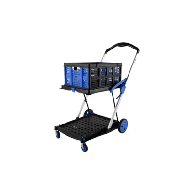 EASY TRANSPORT & STORAGE: A heavy-duty folding trolley with a collapsible crate, perfect for offices, warehouses, and schools—ideal for moving and organising items effortlessly. FOLD-FLAT DESIGN: Collapses to just 180mm deep, making it easy to store in cupboards, under desks, or in car boots—great for saving space. SIMPLE FOLDING MECHANISM: Push-button handle folds the trolley flat in seconds, allowing quick setup and hassle-free storage. DUAL PLATFORM STRUCTURE: Two spacious platforms carry everything from office supplies to bulkier goods, making transport easier. INCLUDES COLLAPSIBLE CRATE: Comes with a 46-litre folding crate for smaller items—folds away when not in use, with extras available. REMOVABLE WHEELS: Easily detach and reattach the wheels for compact storage and effortless transport. DIMENSIONS: 1080(H) x 600(W) x 1000(D) mm when in use, and 780(H) x 600(W) x 180(D) mm when folded. Compact, efficient, and designed for ease of storage. BUILT-IN BRAKE SYSTEM: A central foot brake keeps the trolley secure while loading, unloading, or parked.