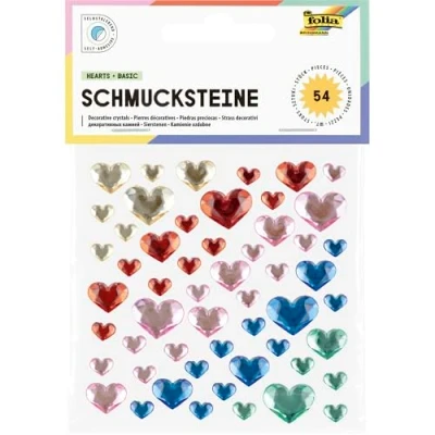 folia 12311 Hearts Basic Heart Shaped Glitter Stones in 5 Colours, Stickers 3 Sizes, Self Adhesive for Decorating and Decorating, Plastic, Multi Colour, Pack of 54