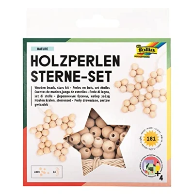 folia 22520 Wooden Beads Set Nature, Craft with 160 Balls and a Gold String for Threading, Crafting Stars Pendants, Multi Coloured