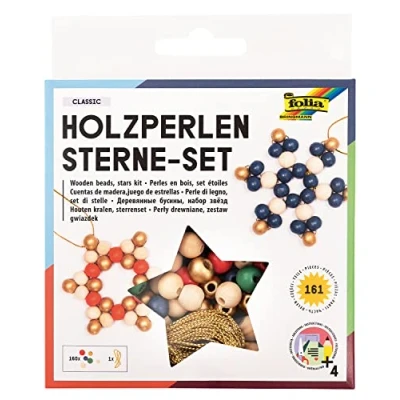 folia 22521 Wooden Beads Stars Set Classic, Craft with 160 Balls and a Golden Cord for Threading, Crafts of Pendants