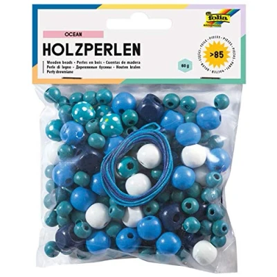 Colourful ocean pearl set made of high-quality wood Craft set consists of 2 strings, each approximately 85 cm long and 60 g wooden beads, which corresponds to up to 85 beads The beads are assorted in white and different blue and turquoise tones Different shapes, such as cylinders, cubes, cones as well as oval and round bodies are ideal for threading jewellery For making individual jewellery chains, bracelets and DIY necklaces