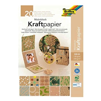folia 48898 Motif Pad Kraft Paper DIN A4 20 Sheets Assorted in 2 Grammages (120 and 230 g/m²) 10 Designs for Crafts Designing