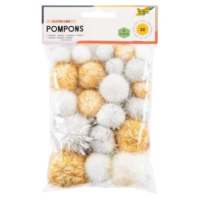 folia 50313 Pompoms Glitter X Mas 30 Fluffy Balls Assorted Sizes and Colours Ideal for Colourful Crafts White/Gold