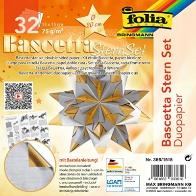 Three-dimensional origami silver / gold Contents: 32 sheets of craft paper, approx. 15 x 15 cm, 75 g/m² Size of the craft star: approx. 20 cm diameter With detailed illustrated instructions (English language not guaranteed) Ideal as a timeless, elegant home decoration, Manufacturer: Max Bringmann