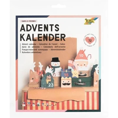 folia 9389 Advent Calendar SANTA & FRIENDS, 72 Piece DIY Craft Set consisting of 24 paper bags with Christmas motifs in 3 sizes, wooden clips red stickers