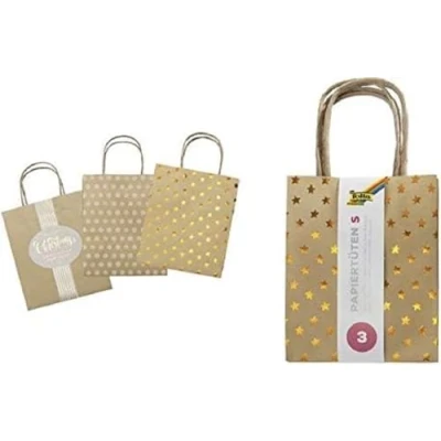 folia x mas Made of Brown Kraft Paper, Bags Partially with hot foil Embossing, Pack 3, Approx. 18 8 21 cm, Assorted in 3 Designs for Crafting, Decorating and Giving as a Gift, Colourful