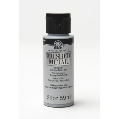 Pale Silver Give your next DIY craft project a brushed finish effect with FolkArt Brushed Metal Metallic Acrylic Paint! Thanks to an easy-to-use brush-on formula, Brushed Metal paints offer superior coverage and high hide. FolkArt Brushed Metal Metallic paints dry to a sophisticated matte finish and can be used on indoor and outdoor projects. Part of the artist-trusted FolkArt creative system of paints and finishes, FolkArt Brushed Metal Metallic Acrylic Paint is made in the USA. PL2511 PE5118 PE5118 MPN 5118