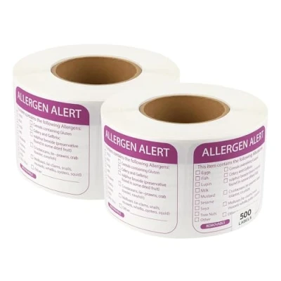 Food allergen warning labels Follows the new EU food allergy labelling law (2014) Adheres to the Food Information for Consumers Regulation (2014) Offers customers vital warning of the allergens present in food Required for commercial establishments as of December 2014 Displays 14 allergens in a tick box layout Removable & disposable