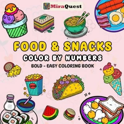 Food and Snacks Color by Numbers: Drink Sweets Coloring Book for Adults Kids, Bold Easy, Simple Big Designs Relaxation Featuring a Variety of Foods, Drinks, Desserts Fruits