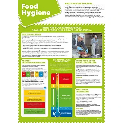 IMPORTANT HEALTH & SAFETY INFORMATION: Presented in structured sections dedicated to ensuring health and safety knowledge, this fantastic Food Hygiene poster can help all employees to understand the importance of food hygiene in the workplace. BRIGHT & ENGAGING DESIGNS: Our health and safety charts are bright, colourful and informative. With bold designs and concise information, this health and safety poster is an excellent resource for your office or workplace. ENCOURAGE HEALTH & SAFETY UNDERSTANDING: Engaging and clear images accompany straightforward content, ensuring all employees will gain a comprehensive understanding of health and safety and, most importantly, its role in a successful workplace. LARGE SIZE: IDEAL FOR READING FROM A DISTANCE: Our health and safety posters are a large size, meaning they are highly readable from a distance and will easily complement your work environment. DECORATIVE WORKPLACE DISPLAYS: Our health and safety poster is a bright and engaging wall chart that can greatly improve the décor of your workplace, whilst providing a useful reference point for employees to refresh knowledge about food hygiene.