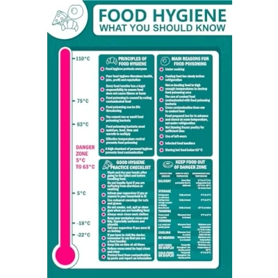 Food hygiene poster what you should know kitchen safety sign. Self adhesive sticker. Printed using the latest digital technology and laminated for extra durability. Remove backing film and apply to dry, smooth, oil free surface. All signs come with a 5-year warranty. All our signs are UV resistant meaning they will not fade in sunlight. Our vinyl stickers are temperature resistant from -40°C to +80°C.
