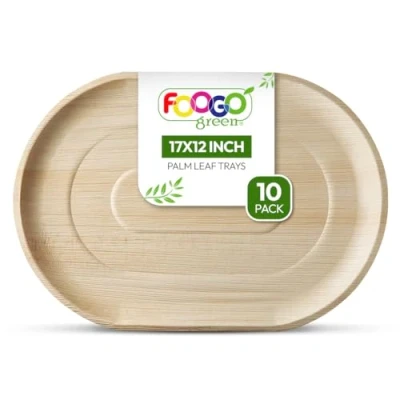 PREMIUM QUALITY and STURDY - Our strong disposable palm leaf serving trays do not bend or collapse under weight and you can hold your food confidently with one hand. Suitable for any type of food – hot, cold, dry, wet, sticky, sweet, spicy – you name it! A true GIFT FROM NATURE – Made from naturally fallen Areca palm leaves, FOOGO Green biodegradable serving trays are 100% natural and free from chemicals or harmful ingredients. A GREENER alternative - Our eco friendly disposable serving trays and platters are biodegradable and can be used instead of plastic trays and foil trays that are harmful to the environment. They are also a great alternative to disposable bamboo trays and wooden trays. STYLISH, natural woody texture - Each piece is uniquely rustic and carries the distinct patterns and textures of the palm leaf it is made from. COMPOSTABLE and BIODEGRADABLE - When used dispose them along with food or garden waste. MICROWAVE and FREEZER safe - FOOGO disposable plates are heat and cold resistant, and can be used for both hot and cold foods, making them perfect for any occasion. One-stop-shop for ECO PARTY SUPPLIES - Our range of products includes party plates and cutlery sets, eco-friendly napkins, biodegradable straws, wooden cutlery sets, disposable bowls and serving trays., Manufacturer: FOOGO Green