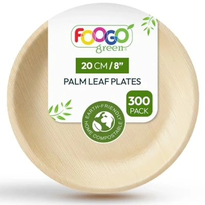 FOOGO Green 300 Disposable Palm Leaf Plates, 8"(20cm) Medium Round, Eco Friendly Biodegradable Compostable Like Wooden Bamboo Paper Plates for Hot Food, Picnic Party