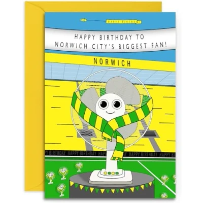 NORWICH BIRTHDAY CARD ⭐ A great card for a Norwich football fan and sure to put a smile on the receiver's face ⭐ Click the second image for the text inside the card. EXTRA THICK CARDSTOCK ⭐ 330gsm triple coated cardstock with a lovely matt inside surface for ease of writing SIZE ⭐This birthday card measure 148 x 210mm (A5 Size) and comes with a 162 x 229mm yellow envelope UK MANUFACTURED ⭐ Printed in our Hampshire factory ECO FRIENDLY ⭐ Our factory runs on 100% renewable energy. Our cardstock is sustainably sourced. Both the card and envelope are fully recyclable.